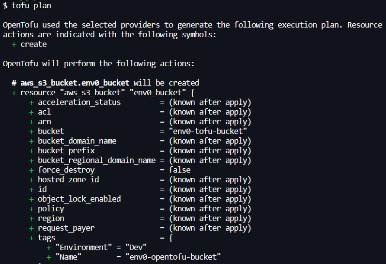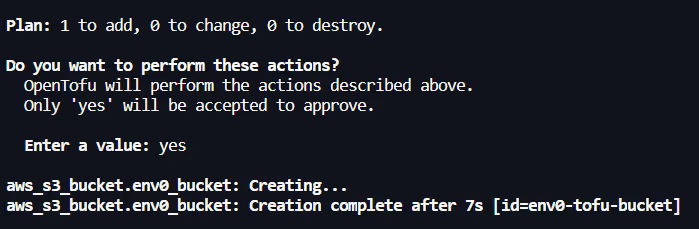 - [.code]tofu apply[.code]: After running the command, Opentofu generates an execution plan again and asks for confirmation. Upon confirming with a ‘yes’, it creates the env zero-tofu-bucket: