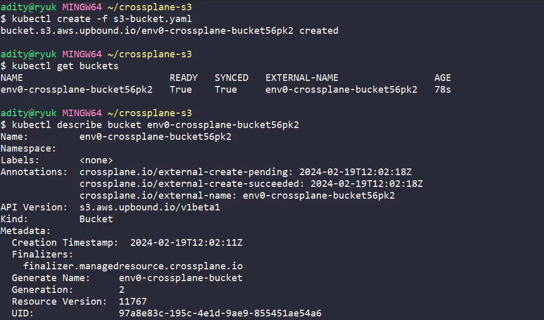 name: defaultAfter running [.code]kubectl apply[.code] command on our CRD, we see that our bucket is provisioned: