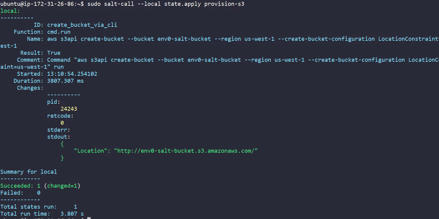 - unless: aws s3 ls s3://env zero-salt-bucketWe provisioned the env zero-salt-bucket by running the [.code]salt-call[.code] command: